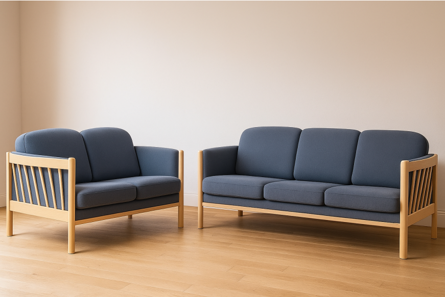 På billedet ses et 2 + 3 prs. Julie sofasæt, samt en Maria stol, med blåt uldbetræk og med ubehandlet bøgetræs stel.