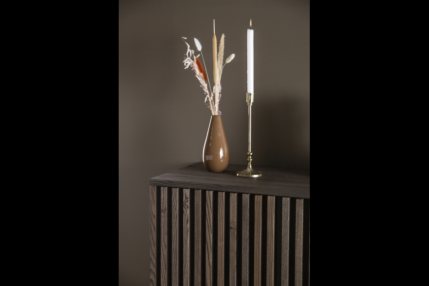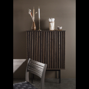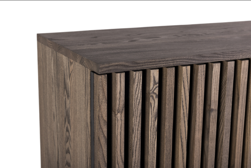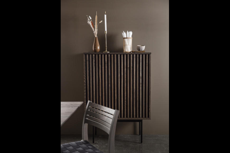 AKUSTIK HIGHBOARD fra Kristensen & Kristensen er designet med ønske om at forbedre akustikken i boligen samt opretholde et pænt udtryk. Kombinationen af trælameller og filt, er ikke blot tænkt ind i designet for at fornøje øjet, men i lige så høj grad for at absorbere rumklang. Highboardet er vist her i massiv mørk grå olieret ask med sort metal sokkel.