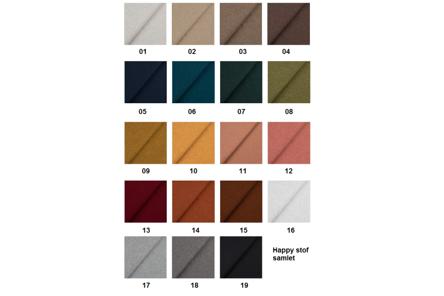 Stof gr. 1: Happy, Samoa, Raquel, Vogue, Posso, Ontario, Leo, Luet, Aragon, Storm.