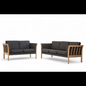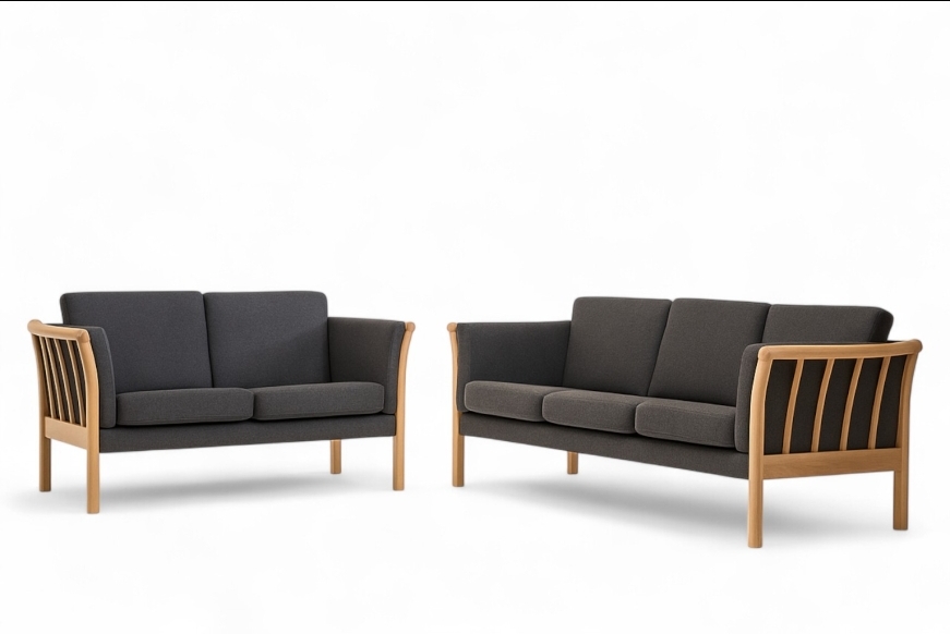 På billedet ses et 3 + 2 prs. Dorte sofasæt, med gråt uldbetræk Misha 432-04 og med bøge lak stel.
