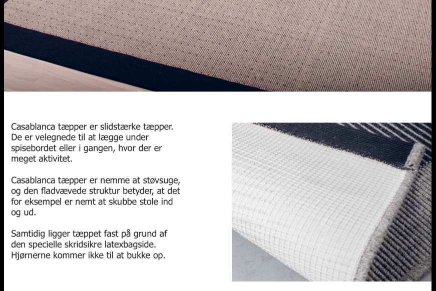 Casablanca tæpper er slidstærke tæpper. Så de er gode at lægge under spisebordet eller i gangen, hvor der er meget aktivitet. Casablanca tæpper er nemme at støvsuge, og den fladvævede struktur betyder, at det for eksempel er nemt at skubbe stole ind og ud.